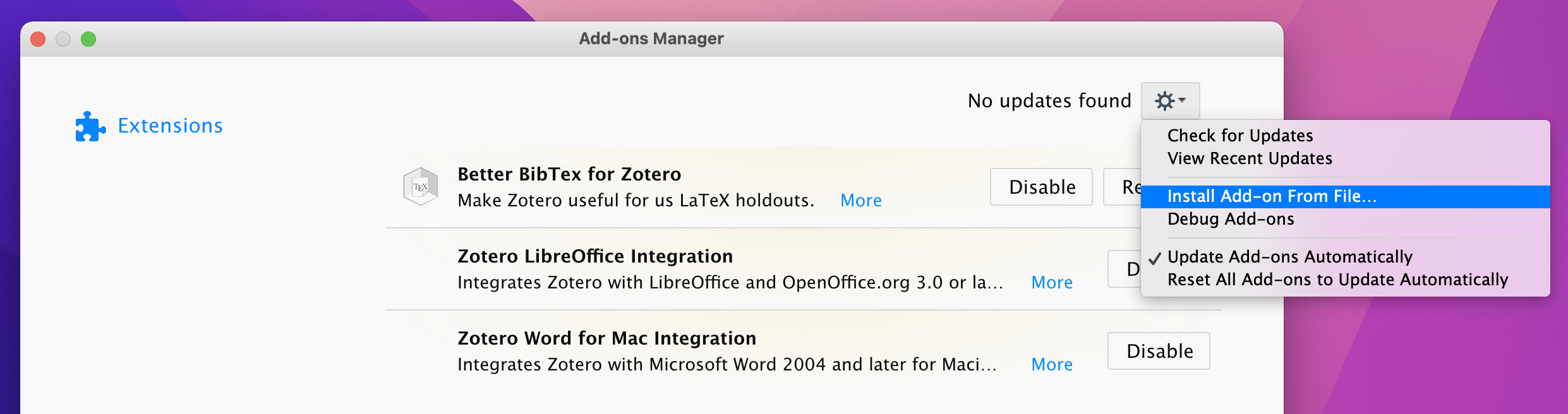 'Tools' -> 'Addons' in Zotero, clicking the gear icon, and selecting 'Install Add-on From File'